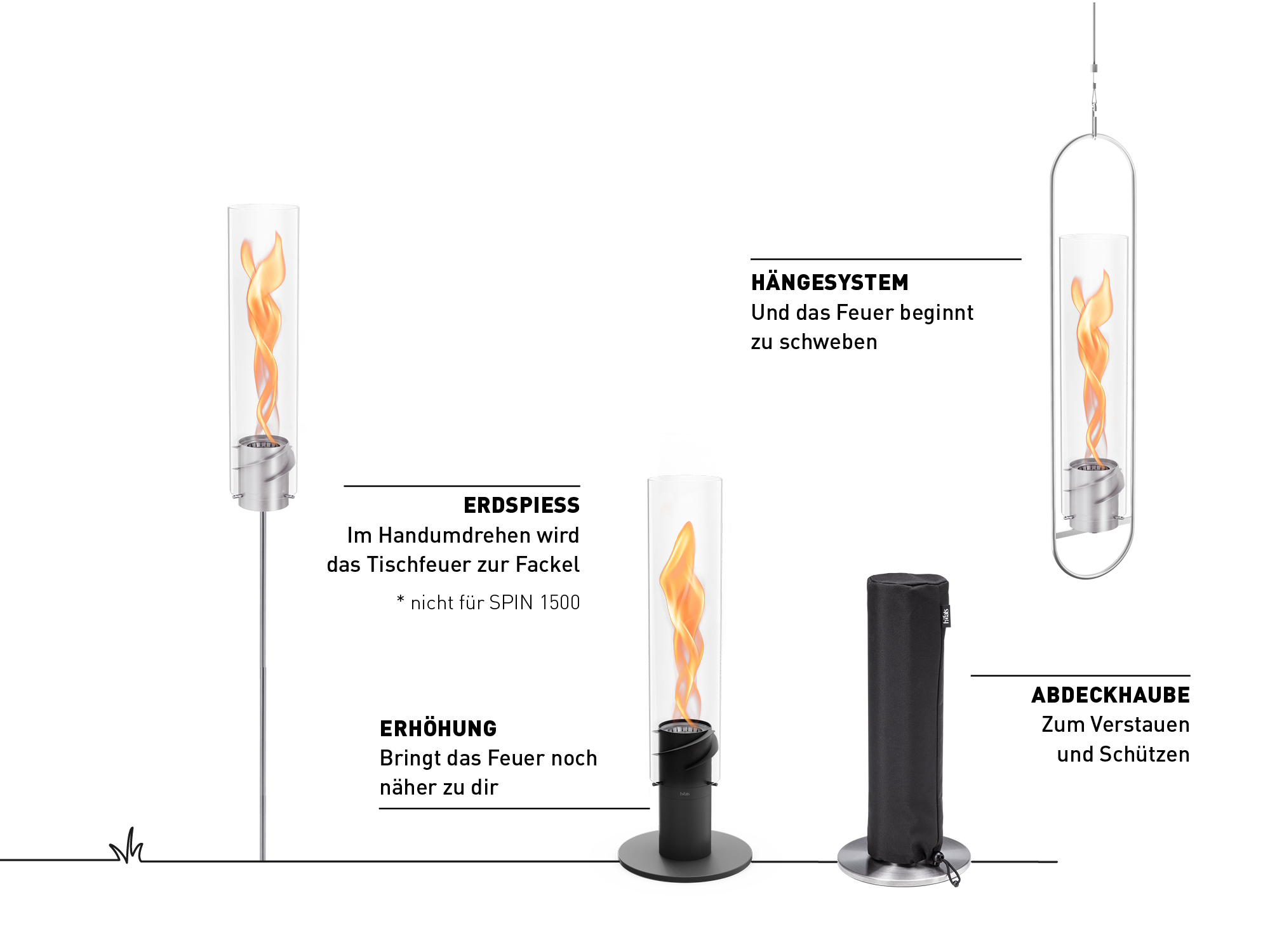 - SPIN als Hängefeuer mit optionaler Erweiterung zum Tischfeuer, Windlicht oder Gartenfackel